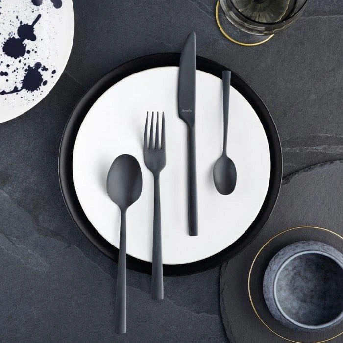 Haz una declaración de intenciones con el Juego de cubiertos Manille All You Need 9035 de 42 piezas. Un atrevido juego de cubiertos negro mate. La cubertería Amefa Manille está realzada con mangos planos que dan al conjunto un aspecto elegante y moderno. Fabricado en acero inoxidable 18/0 con un fino revestimiento de titanio PVD (Physical Vapor Deposition).