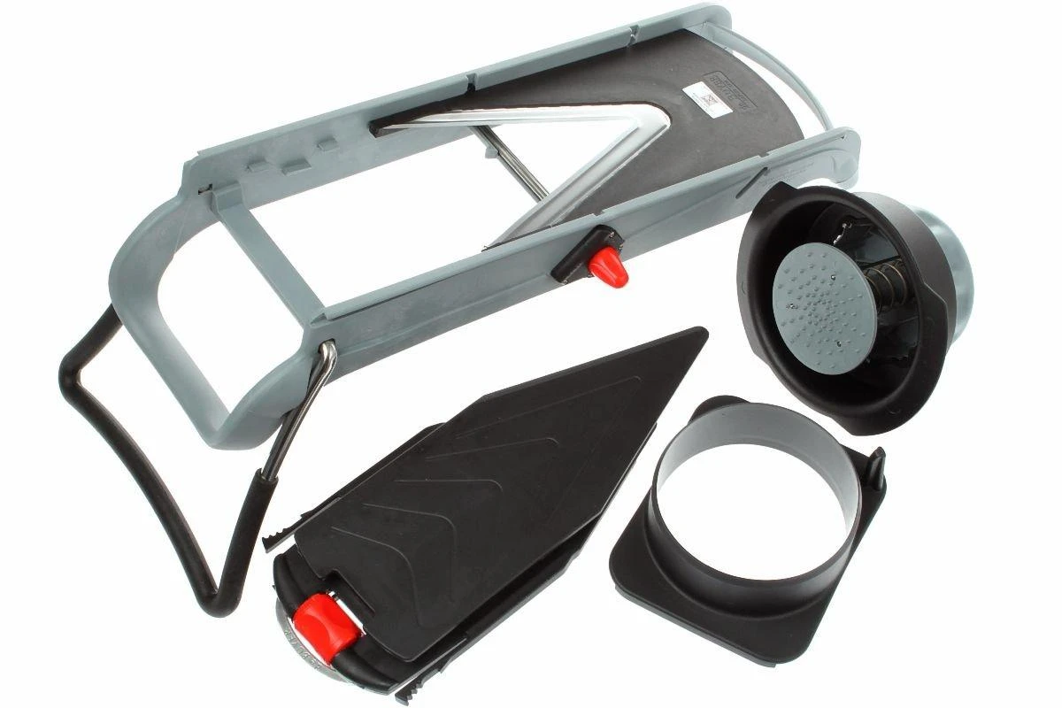 DeBuyer es un fabricante muy reconocido por sus productos que se utilizan en cocinas profesionales. Siguen buscando técnicas y construcciones nuevas e innovadoras. La Mandolin Viper no sólo tiene un aspecto elegante, sino que también funciona de forma muy rápida y cómoda. Puedes elegir el «curso de corte» deseado, que puede tener o no hojas verticales para cortar en juliana. A continuación, ajusta la profundidad de corte con el botón giratorio naranja del mango. Desliza el protector de mano con el «empujador» en el carril de conducción y ¡que comience el corte!