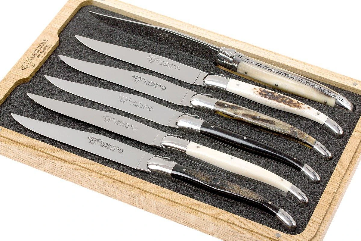 El juego de cuchillos para carne Laguiole en Aubrac de 6 piezas, con mangos hechos de diferentes tipos de cuerno, es un hermoso complemento para cualquier mesa de comedor. Esta auténtica marca Laguiole lleva años produciendo cuchillos de gran calidad. Los cuchillos para carne están hechos a mano y tienen un bonito acabado.
