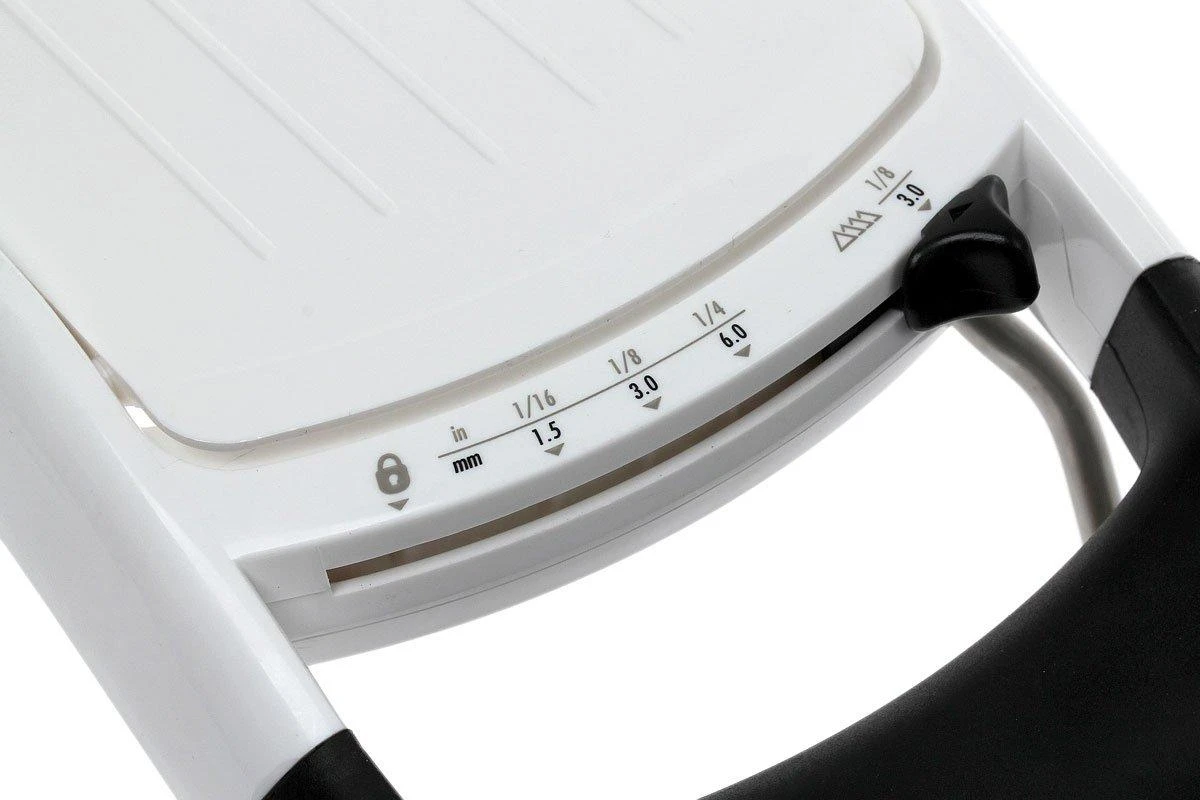 Esta mandolina simple de OXO GoodGrips es fácil de usar, pero ofrece cuatro posiciones de corte. Por eso, puedes cortar rodajas de 1,5 mm, 3,0 mm, 6,0 mm y tiras en juliana de 3,0 mm. Puedes ajustar fácilmente las posiciones con un solo deslizamiento. No hay nada más fácil que esto. Está reforzada con pies antideslizantes para que no se mueva durante su uso. Después de usarla, puedes plegar fácilmente el soporte alto debajo de la mandolina para guardarla de forma compacta.