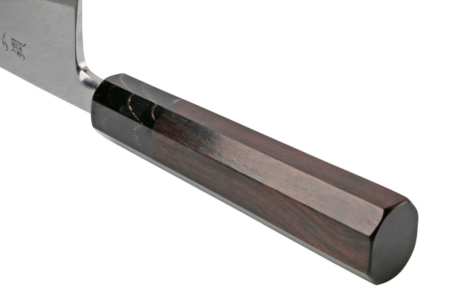 El Sakai Takayuki Blue 2 Steel Japanese Style 01237 deba 18 cm es un robusto cuchillo de cocina japonés. El deba fue diseñado originalmente para filetear y preparar carne y pescado. La hoja es más gruesa que la de un cuchillo de cocina medio, lo que te permite cortar huesos pequeños, ligamentos y tendones sin dañar el filo del cuchillo. Este cuchillo está afilado por un lado, mientras que el otro está ahuecado. Esto asegura que la carne o el pescado no se pegue y se caiga de la hoja con facilidad mientras estás cortando.