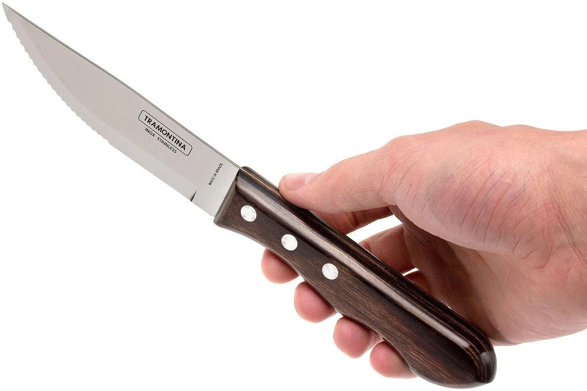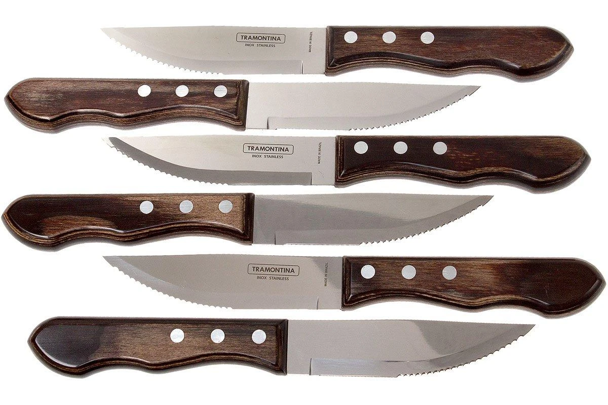 Los cuchillos para carne de Tramontina pueden hacer frente a cualquier tipo de carne asada. La hoja es de acero inoxidable y los mangos son de madera. Los remaches de acero inoxidable hacen que las cachas se mantengan en su sitio. Según el proveedor, la madera está modificada y es apta para el lavavajillas. No obstante, recomendamos encarecidamente no meter estos cuchillos en el lavavajillas.