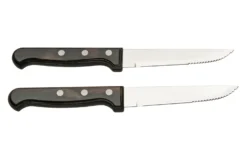 Este Juego de cubiertos para carne Jumbo de Tramontina puede manejar cualquier tipo de carne asada. La hoja es de acero inoxidable y los mangos son de madera. Los remaches de acero inoxidable hacen que las cachas se mantengan en su sitio. Según el proveedor, la madera está modificada y es apta para el lavavajillas. No obstante, recomendamos encarecidamente no meter estos cuchillos en el lavavajillas.