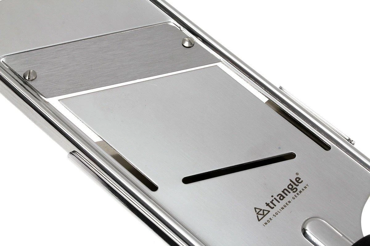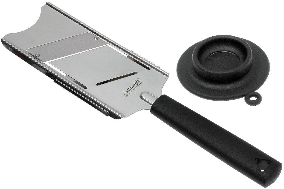 El cortador Triangle es ideal para cortar rápidamente verduras y frutas. El cortador está hecho de acero inoxidable. La parte trasera del cortador Triangle está reforzada con un tornillo con el que se puede determinar el grosor del corte. De este modo, se pueden cortar láminas muy finas de, por ejemplo, trufa, ajo o pimienta, pero también láminas más gruesas de, por ejemplo, patatas o pepino.
